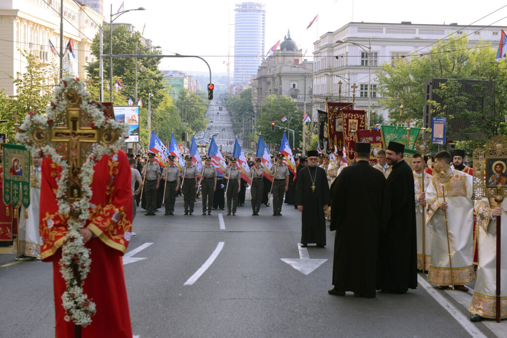Припадници Гарде Војске Србије, кадети Војне академије и војни свештеници корачали су централним престоничким улицама у молитвеном ходу, уз највеће светиње – икону пресвете Богородице Тројеручице, мошти и иконе Светог деспота Стефана Лазаревића и Свете Петке у свечаној славској литији, коју је предводио Његова Светост Патријарх српски господин Порфирије.